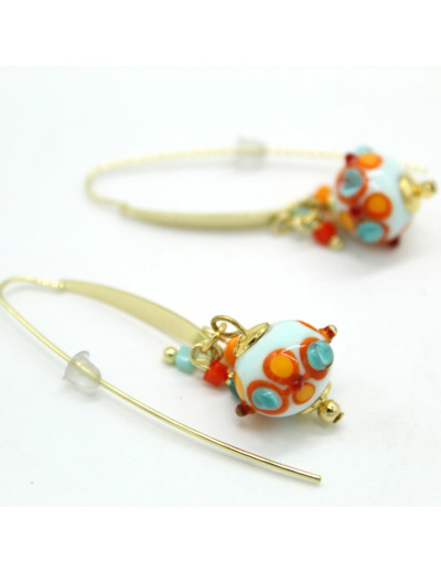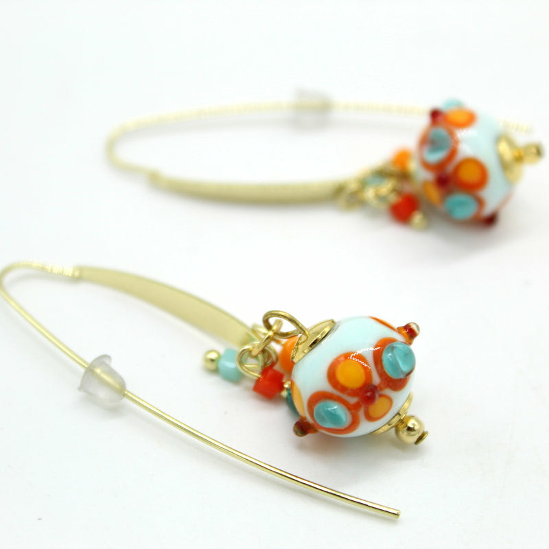 Boucles d'oreilles longs crochets en acier, perles en verre de Murano mint décor bleu lagon, orange, corail, autres perles en verre.