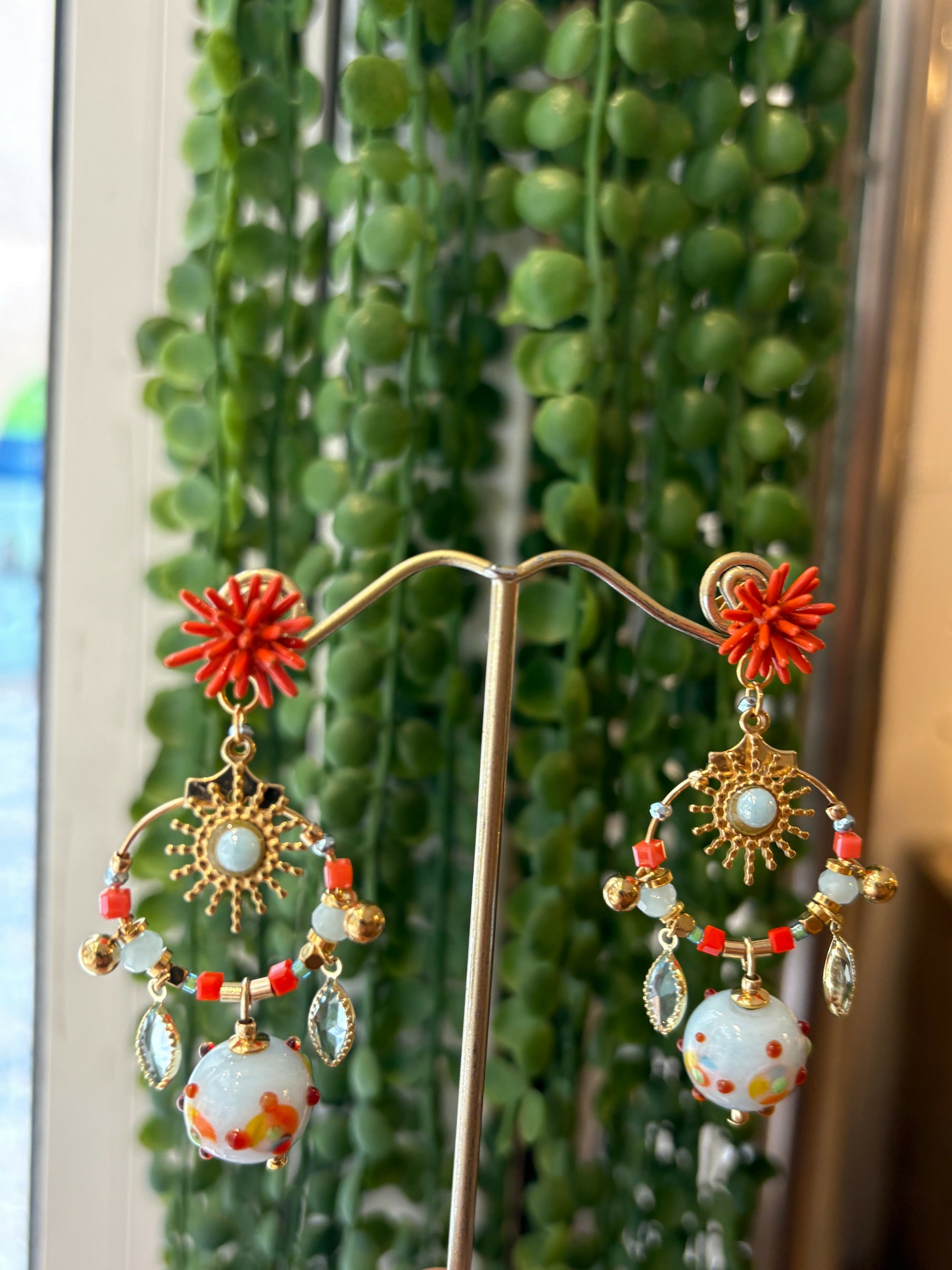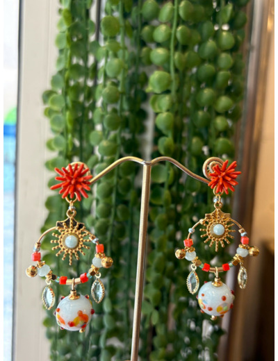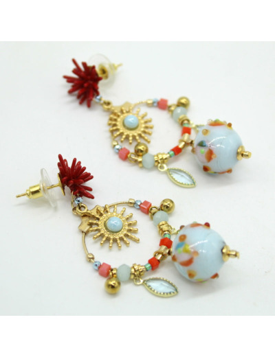 Boucles d'oreilles fermoir puce doré, perles en verre de Murano bleu ciel opaline décor multicolore corail, jaune, vert, bleu, jaune, autres perles en verre, motif en émail et cristal.