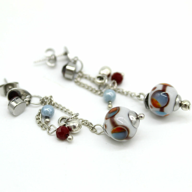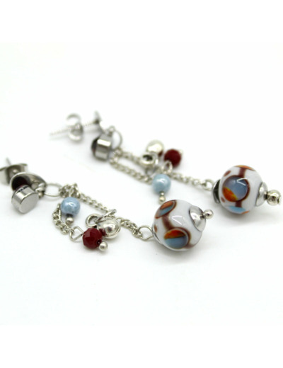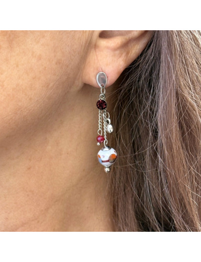 Boucles pendantes à fines chaînes, fermoir en acier décorées de petites perles en verre et d’une perle de Murano grise filée à la flamme, décor bordeaux et touches multicolores. Un cristal bordeaux vient enrichir la composition. Jeu de lumière et de mouvement garanti.