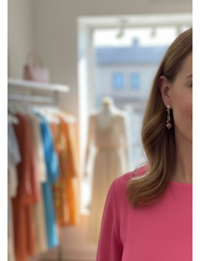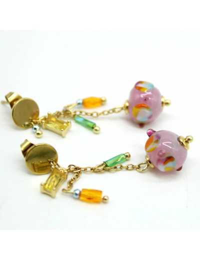 Les boucles d’oreilles chainette allient légèreté et éclat. Une petite puce en forme de goutte en acier doré, une fine chaîne en acier fin, et une perle filée en verre de Murano rose au décor multicolore s’harmonisent avec des pampilles en cristal jaune pâle et des perles de verre vert et orange.