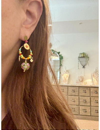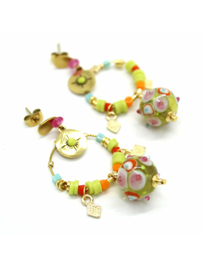 Boucles d'oreilles fermoir en acier, perles en verre de Murano transparent anis, décor anis, orange, fuchsia, poisson doré, autres perles en verre.