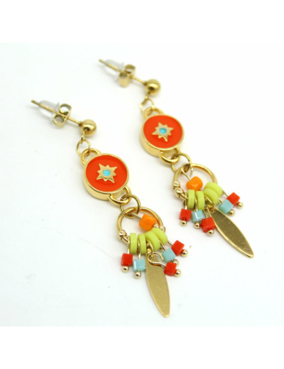 Boucles d'oreilles fermoir boule en acier, motif émaillé orange, perles en verres mint et orange.