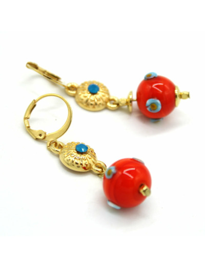 Boucles d'oreilles oursins doré avec cristal Swarovski bleu et perles en verre de Murano rouge décor bleu.