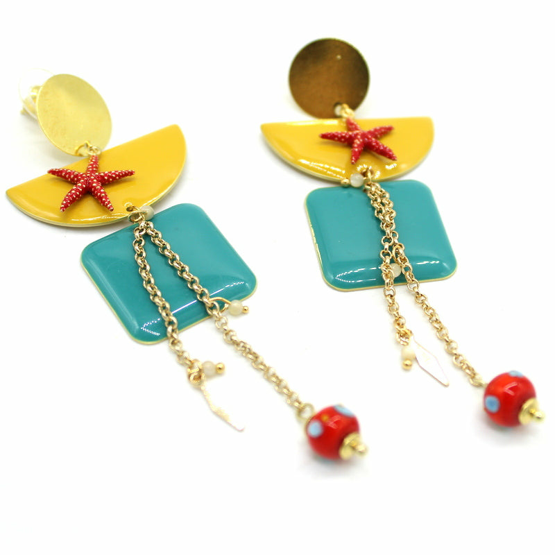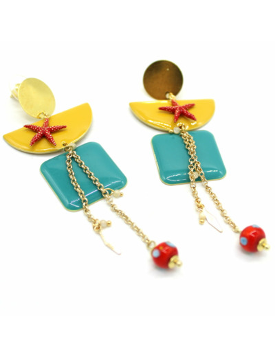 Boucles d'oreilles avec perle en verre de Murano rouge décoré d'un fil bleu dégradé, motifs émaillées jaune et bleu, nacres.