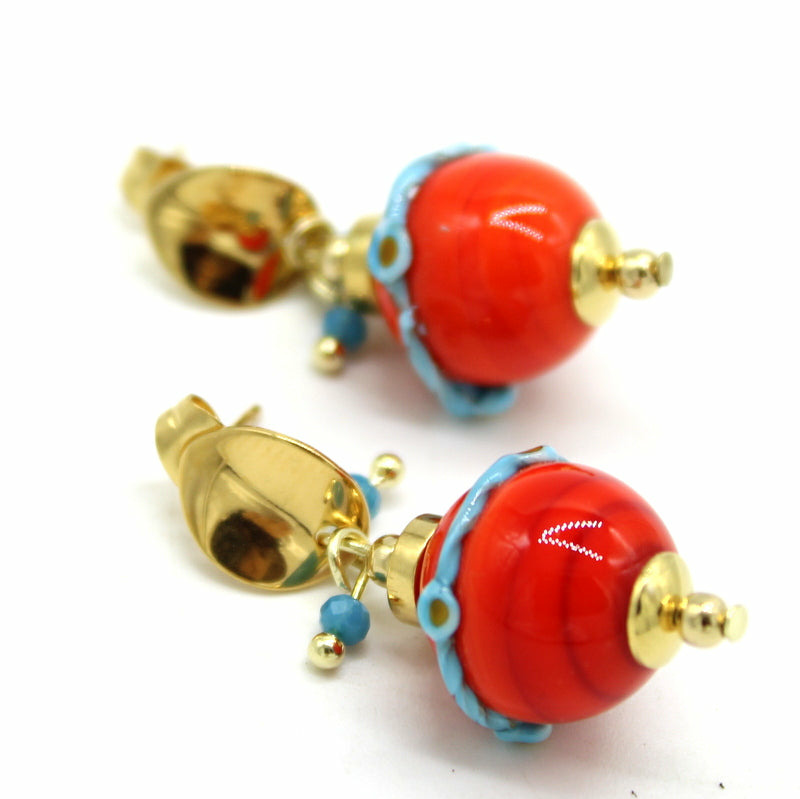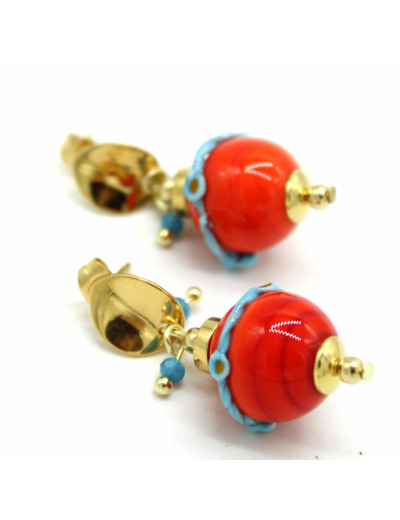 Boucles d'oreilles puces en acier doré avec perles en verre de Murano rouge décor fil torsadé bleu, autres perles en verre bleu.