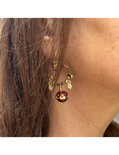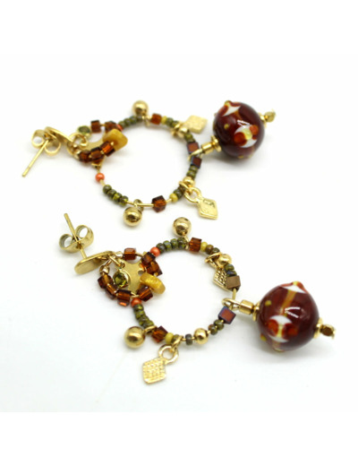Créoles dorées rehaussées de petites pampilles dorées avec perles filées en verre de Murano marron, décor ivoire, kaki, orangé. Fermoir tige en acier.