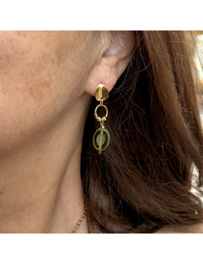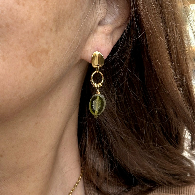 Boucles longues avec perles en verre kaki incrustées de fleurs. L’élégance naturelle des tons terreux.