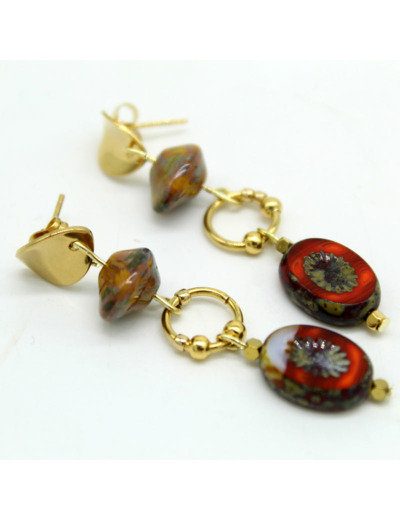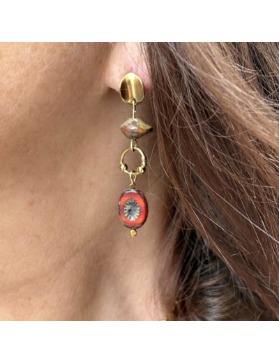 Boucles pendantes ornées de perles décorées de fleurs en teinte terracotta. Une création pleine de caractère, douce et chaleureuse. Fermoir en acier doré.