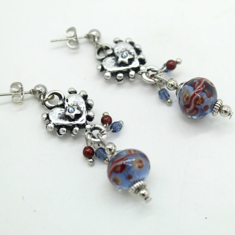 Boucles d'oreilles tige en acier, perles en verre de Murano bleu transparent décor gris perle et bordeaux, autres perles en verre.