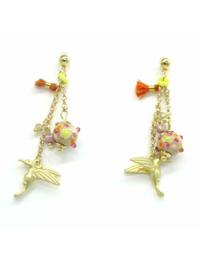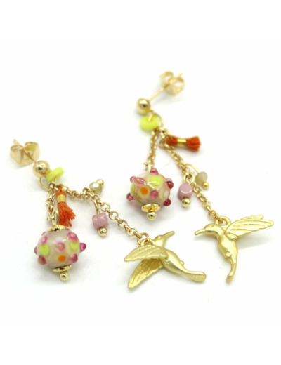 Boucles d'oreilles créoles ornées de jolis colibri doré, perles en verre de Murano beige irisé décor orange, vert anis, rose, autres perles en verre, fermoir en acier.