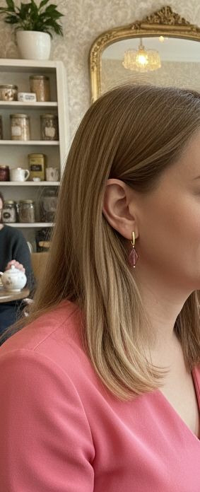 Ces boucles Yuna associent la géométrie et la sensualité des matières. Un fermoir goutte en acier doré porte une perle en forme de losange rose fuchsia, éclatante et graphique.