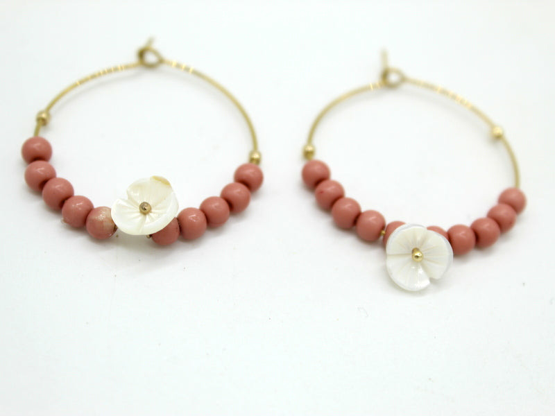 Boucles d'oreilles créoles en acier, perles en verre rose, fleur en nacre.