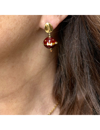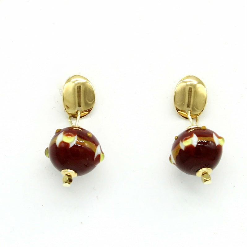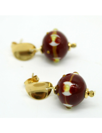 Puces en acier doré à surface ondulée, avec perles filées en verre de Murano dans des nuances chocolat, kaki, ivoire et terracotta.