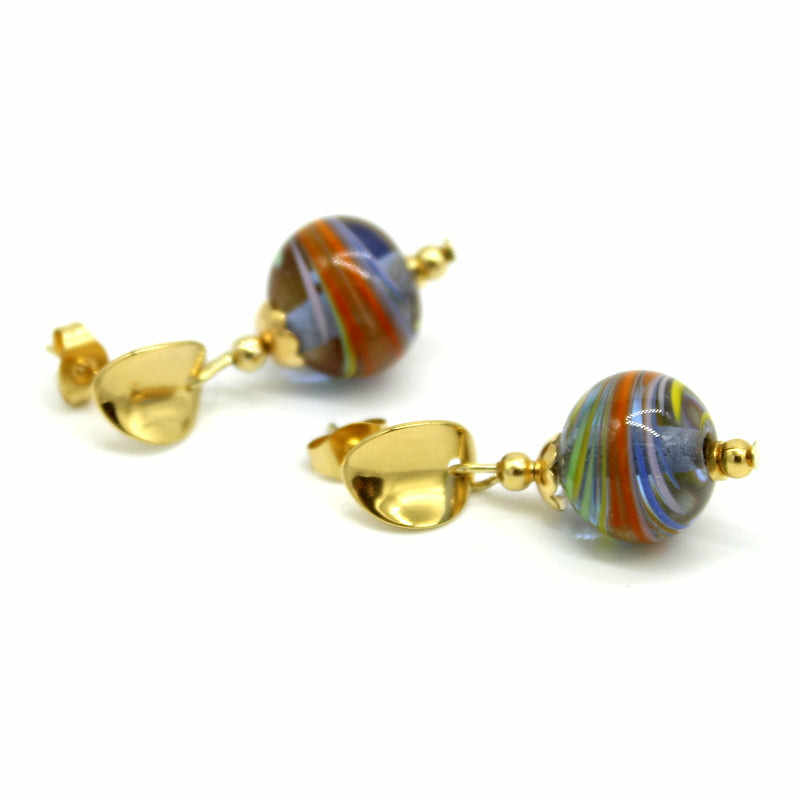 Fermoir en acier ondulé associé à une perle en verre de Murano bleu transparent décor multicolore. Un design simple relevé par une perle d’exception.