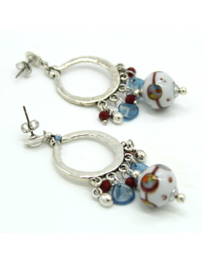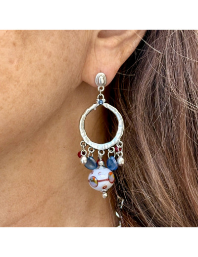Grandes boucles ornées d’un motif rond argenté, d’où pendent des pampilles en verre bleu de Nîmes et bordeaux. Une perle filée en verre de Murano grise, décorée de bordeaux et touches multicolores, magnifie l’ensemble. Une pièce forte et vibrante.