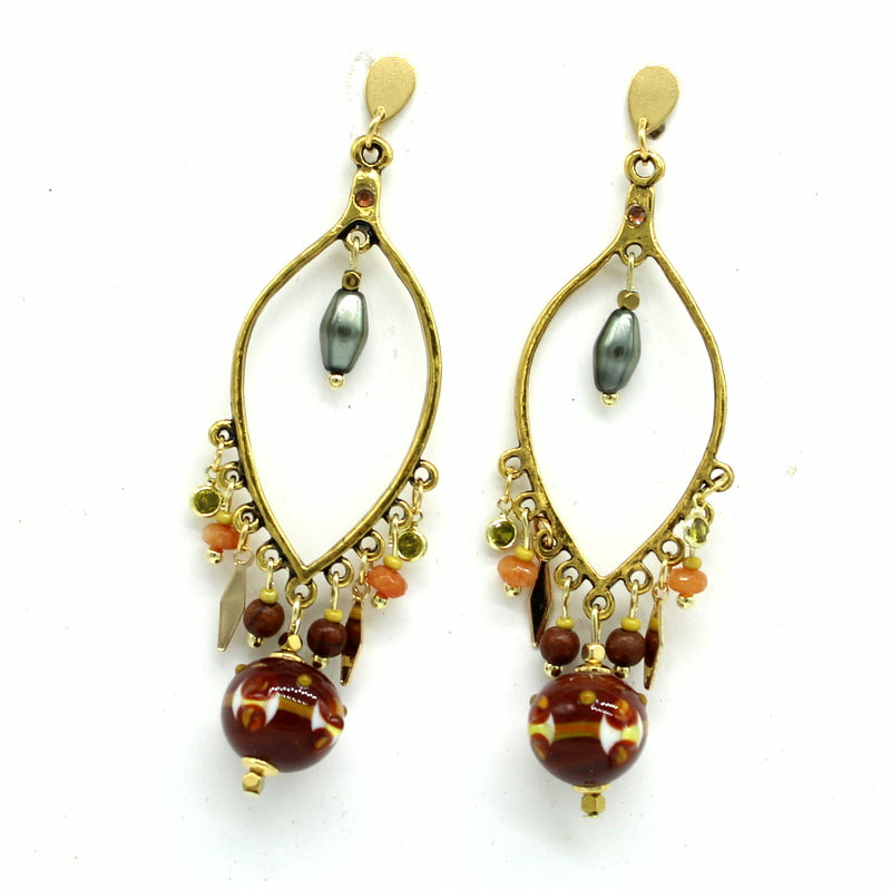 Grandes boucles pendantes, ornées de pampilles dorées et de perles filées en verre de Murano chocolat, ivoire, terracotta et kaki. Fermoir tige en acier doré.