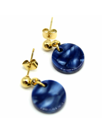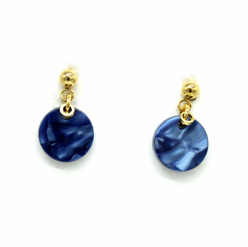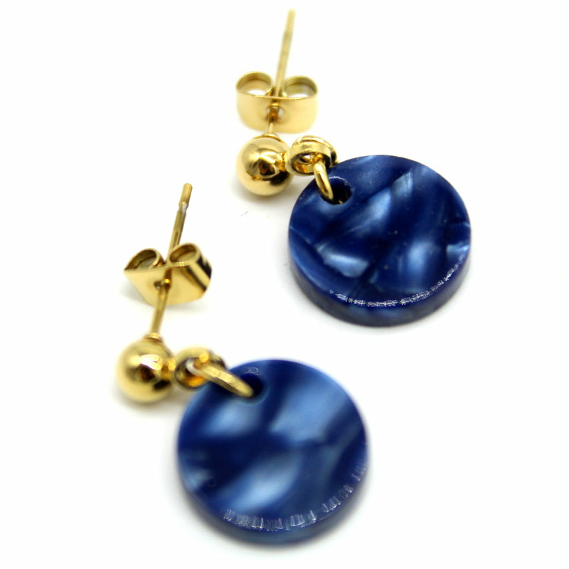 Boucles d’oreilles minimalistes avec une pastille en résine bleue et un fermoir en acier.