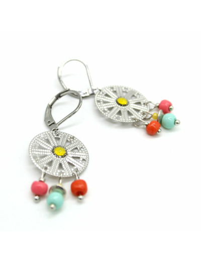 Dormeuses en acier, petites perles en verre, cristal Swarovski jaune.