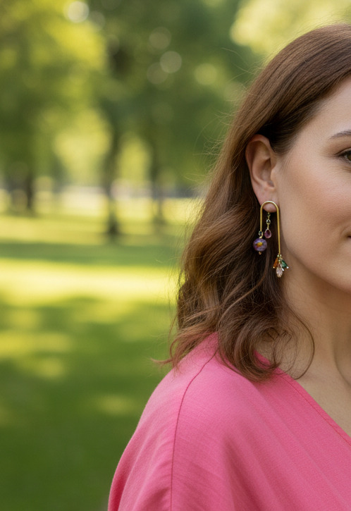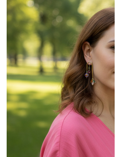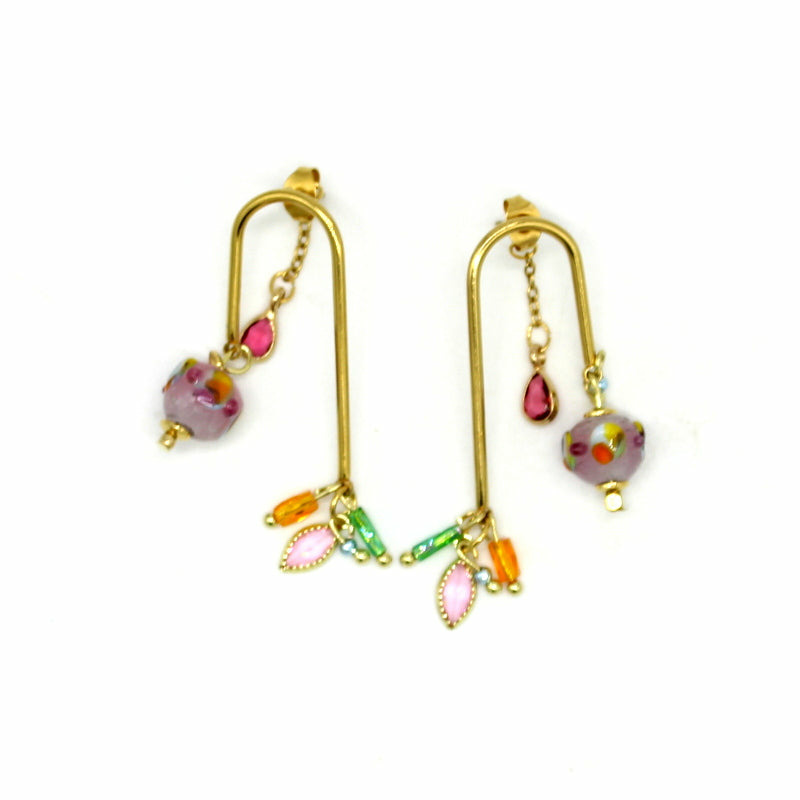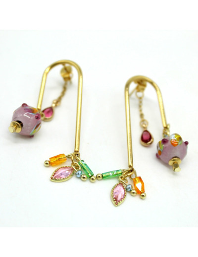 Un design audacieux et plein de caractère. Ces boucles d’oreilles Yuna dessinent un petit pont doré, orné de perles filées en verre de Murano, d’un cristal rose, et de perles en verre scintillantes.