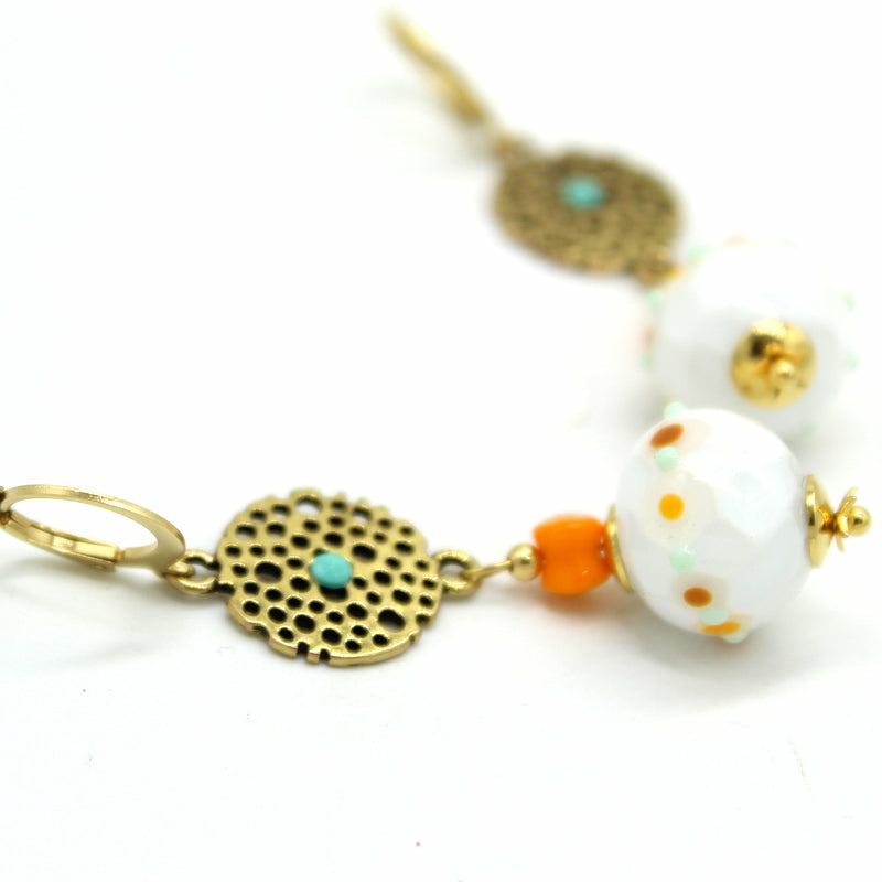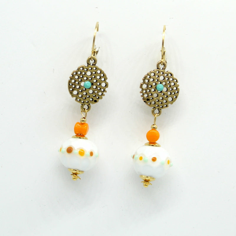 Boucles d'oreilles dormeuse en acier, avec perles en verre de Murano blanc décor orange, beige.