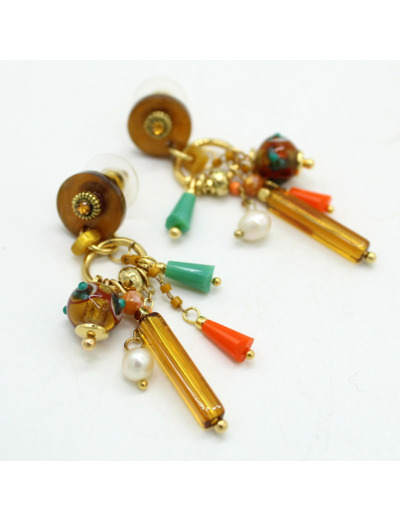 Boucles d'oreilles fermoir résine marron, perles en verre de Murano topaz transparent, vert, ivoire, orange, autres perles en verre, cristal.