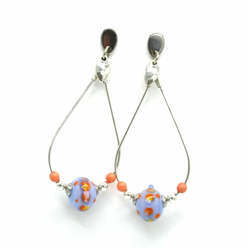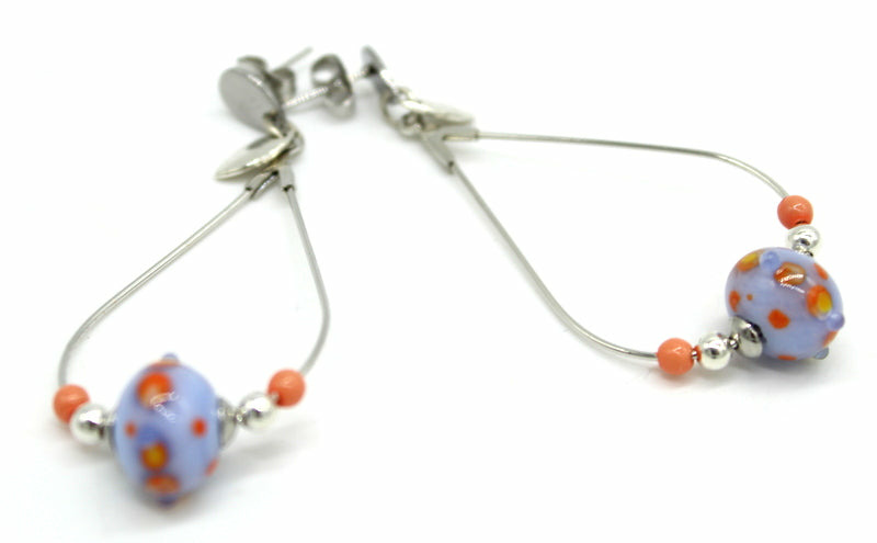 Boucles d'oreilles en acier, perles en verre de Murano bleus opaline décor corail, rose, jaune.