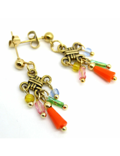 Petites boucles d’oreilles avec un motif en métal doré, des petites perles en verre et un fermoir en acier doré.