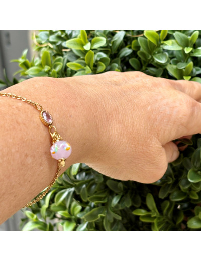 Le bracelet Yuna marie la finesse d’une chaîne en acier doré à la douceur d’un intercalaire en cristal rose.