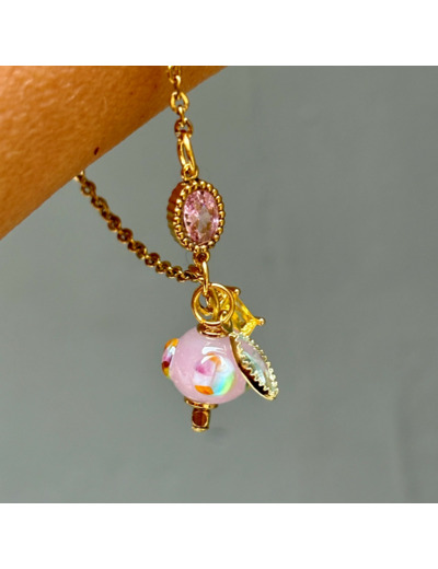 Suspendue au centre, une perle filée en verre de Murano rose, au décor multicolore chatoyant, s’entoure de petits cristaux jaune et bleu ciel.