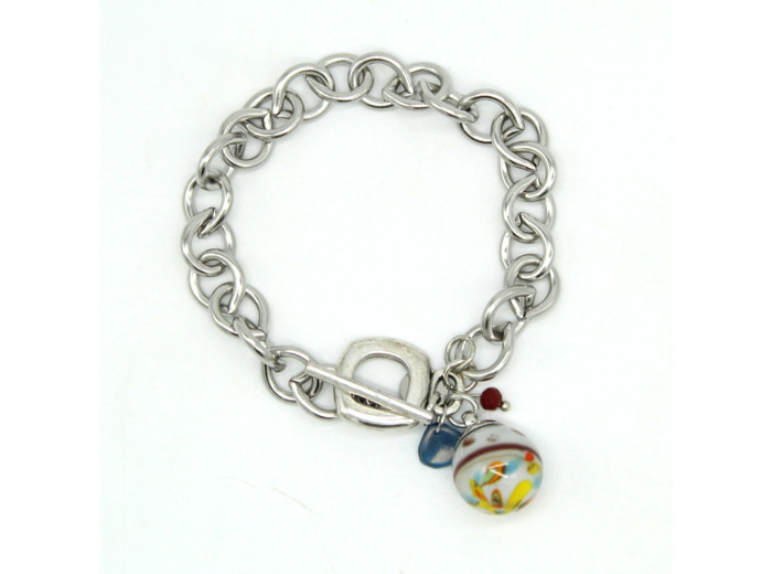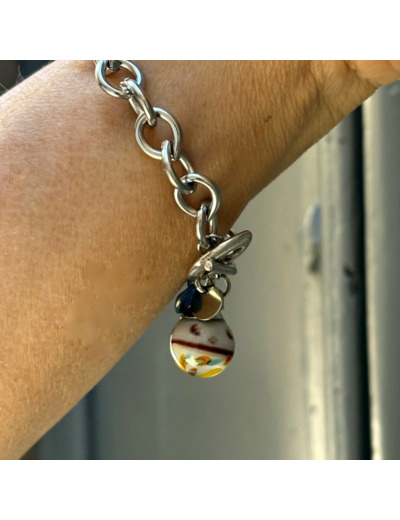 Bracelet audacieux sur grosse chaîne en acier argenté, mis en valeur par une perle bicolore façonnée en verre de Murano. Transparence cristalline et gris profond s’entrelacent, rehaussés de décor bordeaux et de touches multicolores. Une pièce forte et contemporaine.