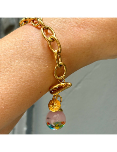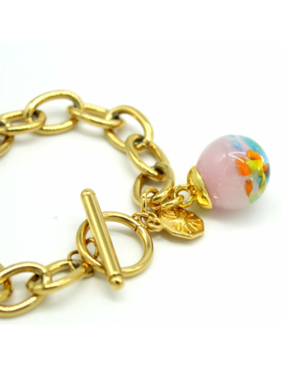 Bracelet Yuna se distingue par sa perle bicolore rose et multicolore en verre de Murano, filée à la flamme dans l’atelier.