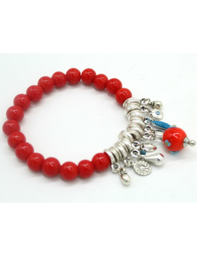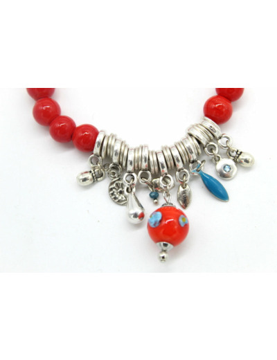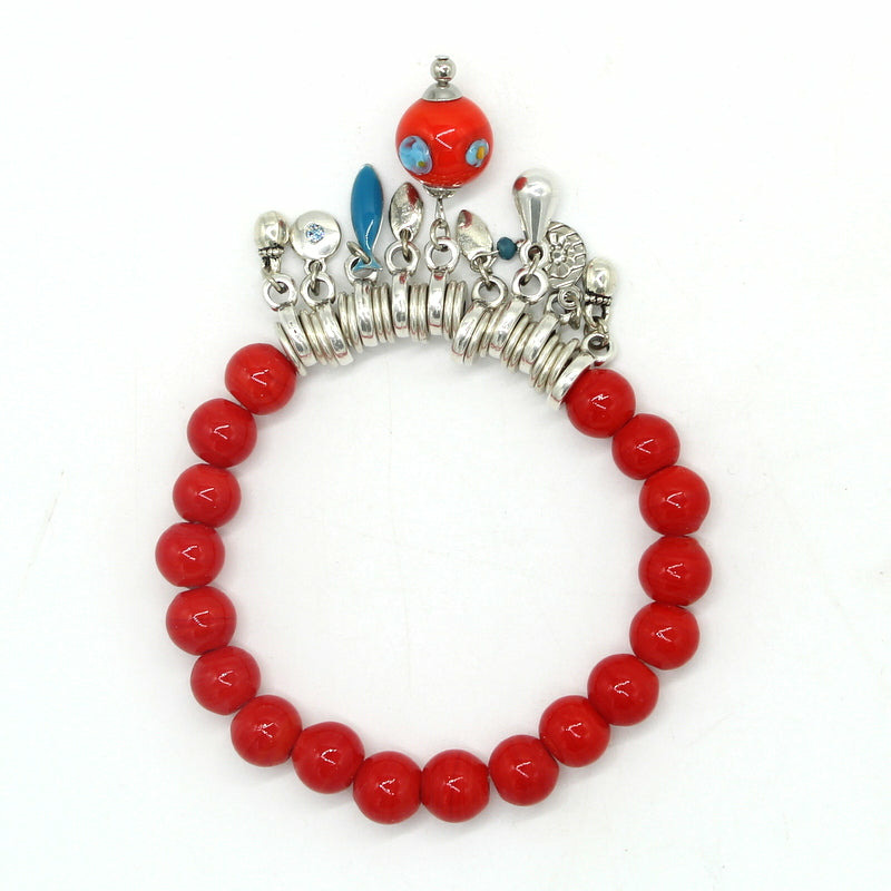 Bracelet argenté, perles en verre de Murano rouge décoré d'un fil torsadé et fusionné bleu dégradé, autre perle en verre rouge, poisson émaillé bleu, cristal Swarovski bleu.