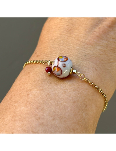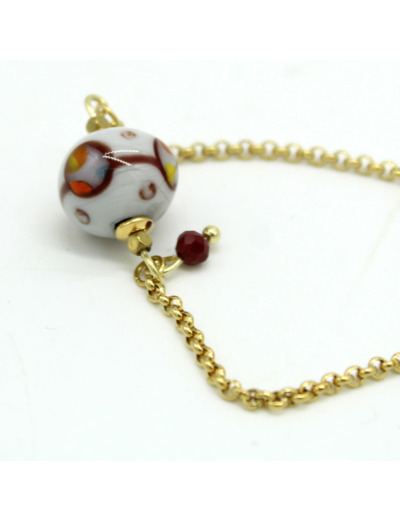 Bracelet réglable chaîne d’acier doré, grâce à une bague coulissante qui s’adaptent au poignet. Au centre, une perle en verre de Murano, gris élégant, décor bordeaux et touches multicolores. Un bijou à la fois pratique et raffiné.
