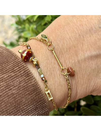 Un bracelet double, assorti au collier. Les chaînes en acier doré sont ponctuées de petits motifs et de perles en verre. La pièce maîtresse : une perle filée en verre de Murano chocolat, décorée de terracotta, kaki et ivoire. Un bijou harmonieux, qui rappelle les paysages aux teintes chaudes.