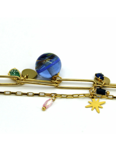Un bracelet double rang en acier doré, avec une perle en verre de Murano bleu transparent décor multicolore, avec pampilles en émail et autre perles en verre.
