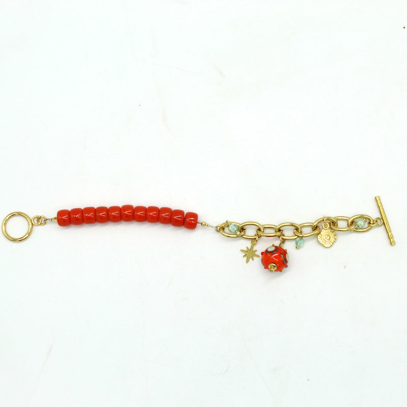 Bracelet avec chaine en acier, fermoir T, perles en verre de Murano rouge, décor turquoise et jaune, autres perles en verre.