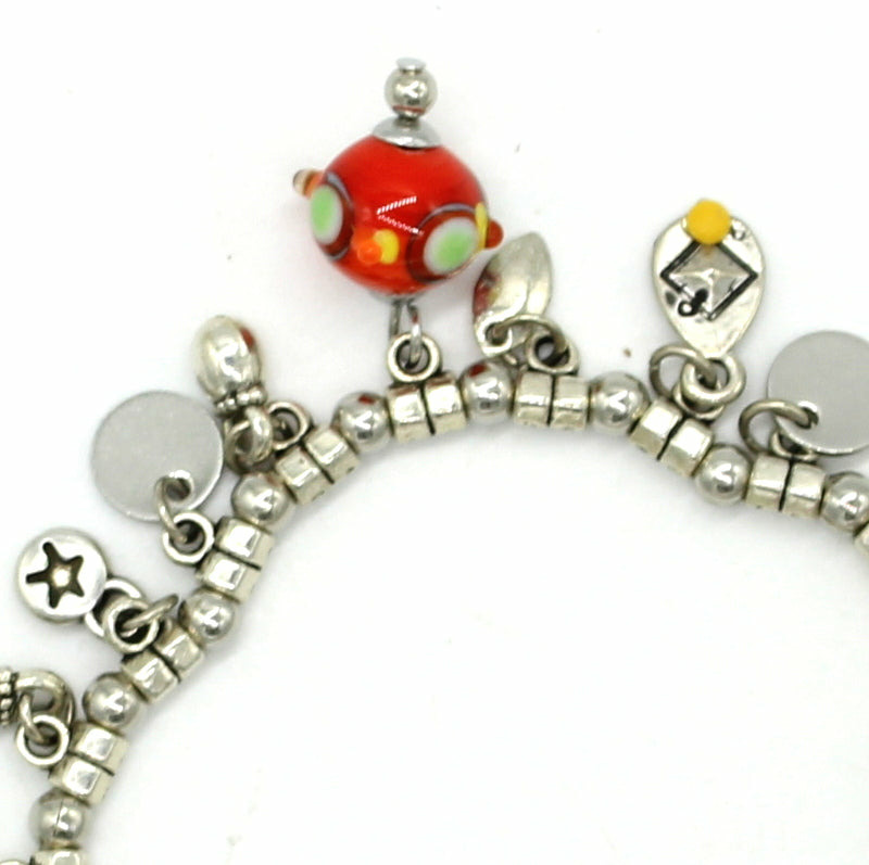 Bracelet en métal argenté extensible , perles en verre de Murano rouge, décor turquoise et jaune, agathes bleues, autres perles en verre.