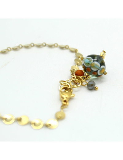 Bracelet chaine en acier doré, fermoir mousqueton, perle en verre de Murano gris vert transparent décor ivoire, brun, bleu, safran, autres perles en verre.