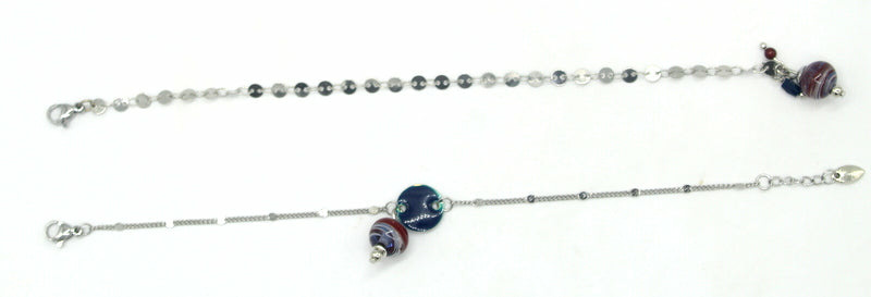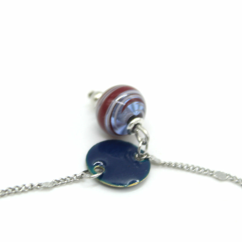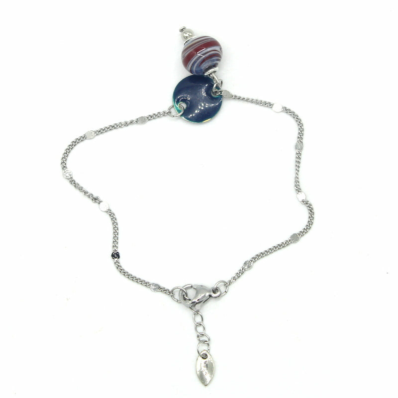 Bracelet chaine en acier, perles en verre de Murano bleu transparent décor gris perle et bordeaux, intercalaire en émail bleu nuit.