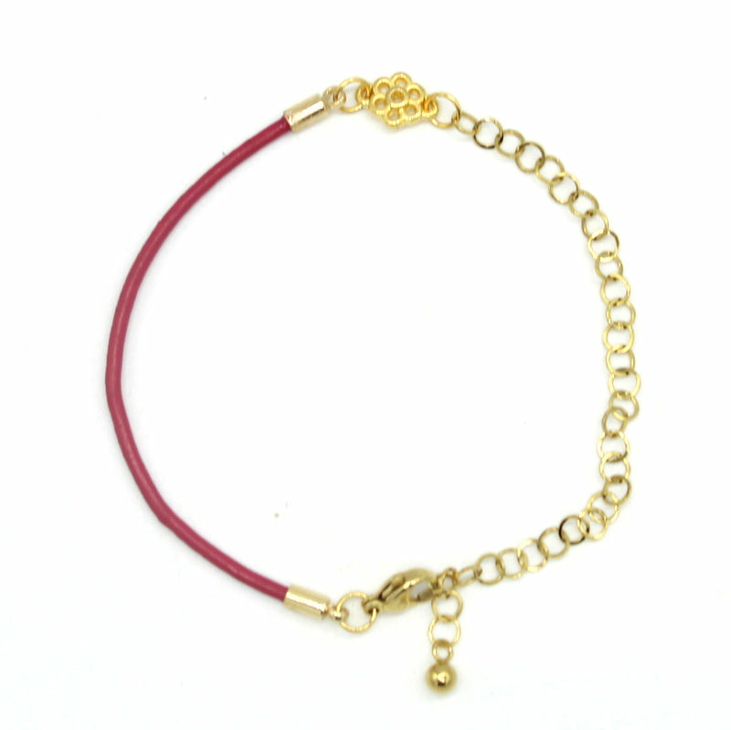 Bracelet bi-matière, cuir et acier doré, avec motif fleur. A porter seul ou choisissez votre combinaison de perle en verre de Murano, à rajouter au gré de vos envies.