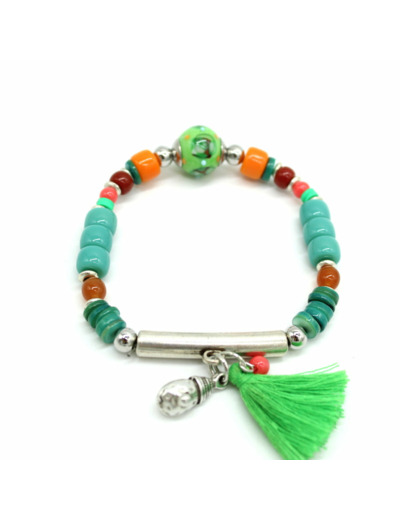 Bracelet sans fermoir(strech), perles en verre de Murano vert décor rouge, mandarine, bleu, agathe teinté rose, résine, autres perles en verre.