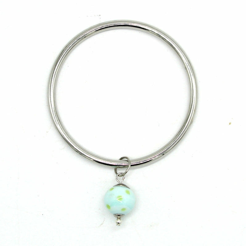 Jonc en métal argenté, perle en verre de Murano mint décor kaki, bleu, orange, autres perles en verre.