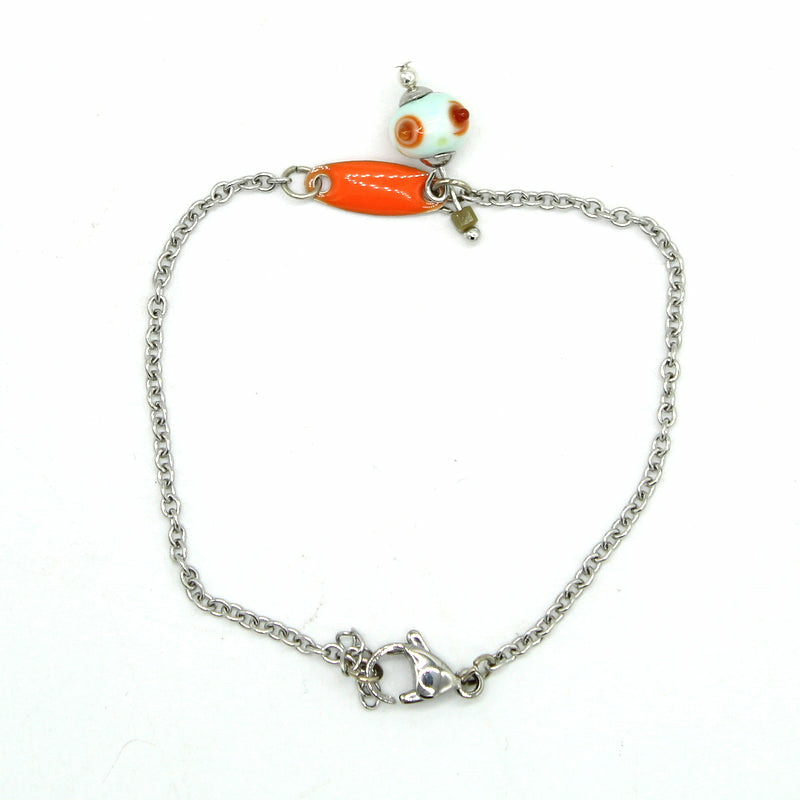 Bracelet avec chaine en acier, perle en verre de Murano mint décor kaki, bleu, orange, intercalaire en émail orange.
