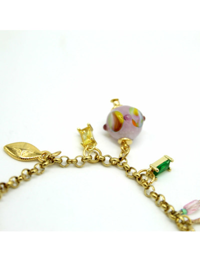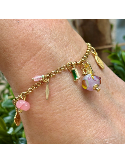 Bracelet Yuna avec une chaîne dorée à pampilles ornée de petites agates roses, de perles en verre, et d’une perle filée à la flamme en verre de Murano rose au décor multicolore.