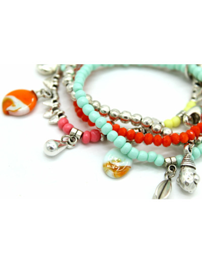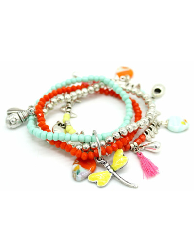 Bracelet sans fermoir sur 4 rangs, perle en verre de Murano mint décor rose l'or, orange, jaune, papillon émaillé jaune.