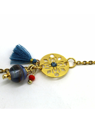 Il est orné d’une perle en verre de Murano bleu transparent décor multicolore, accompagnée d’un petit pompon bleu.