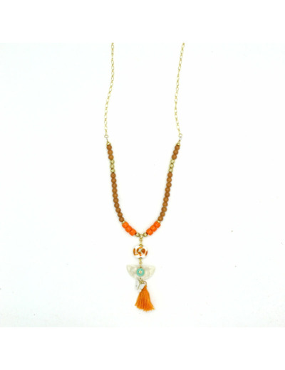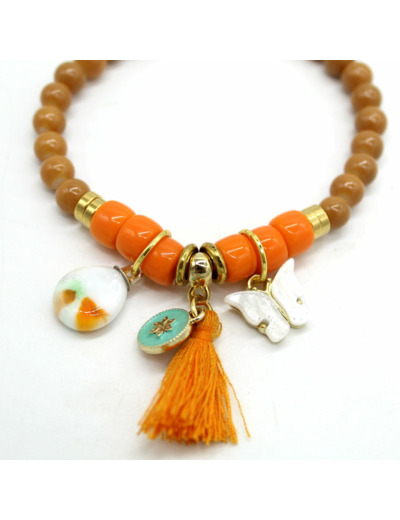Bracelet sans fermoir (monté sur strech) avec perles en verre de Murano blanc décor orange, beige, autre perle en verre, rondelles en résine, motif émaillé doré à l'or fin.