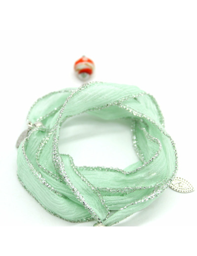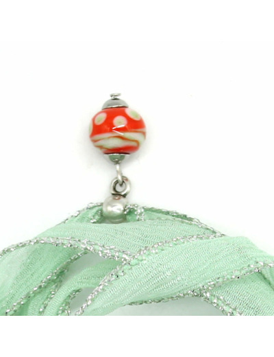 Bracelet en soie, s'enroule autour du poignet sur 4 tours, réglable grâce au stoppeur argenté, perles en verre vert d'eau, perles en verre de Murano rouge, décor vert d'eau.
