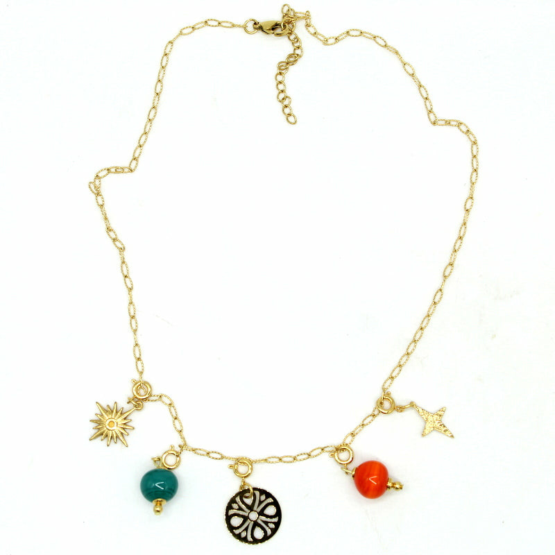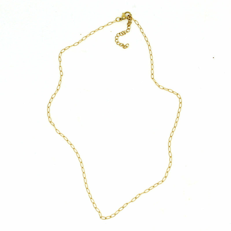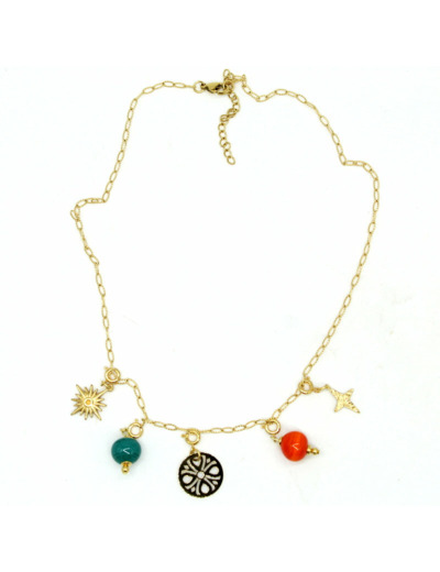 Le collier en acier doré et le bracelet attendent d’être composés, personnalisés, transformés.