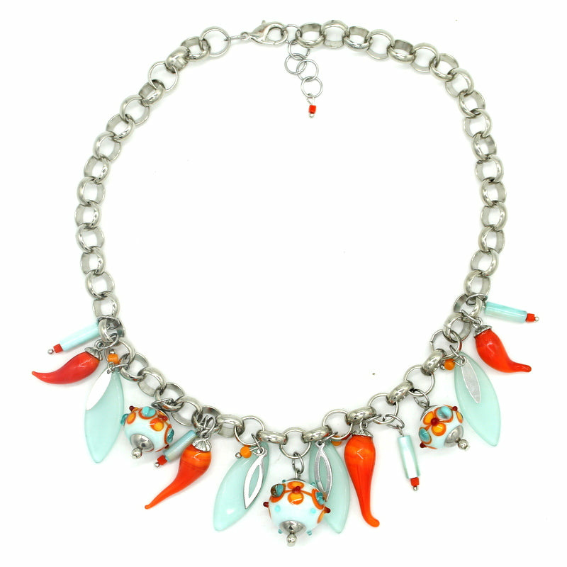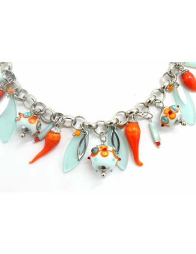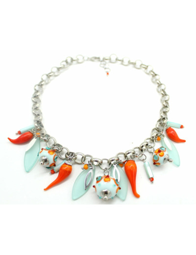 Splendide collier ras de cou argenté avec perle en verre de Murano mint décor, orange, rouge corail, bleu lagon, jaune soleil, piment orange et autres perles en verre.